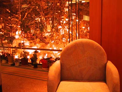 灯りに照らされた雪が白く、紅く輝いている。
