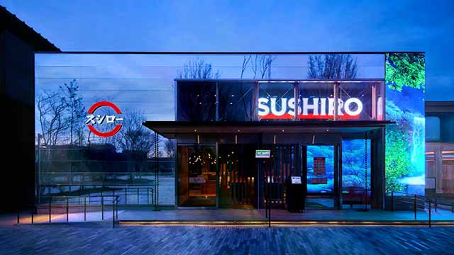 店舗内 ステージLED&壁面LCD&天井LED スクリーン全体を連動させたサイネージ