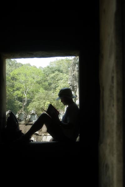 アンコールワットには昼から夕方までの間、バスで押し寄せる観光客がかなり多いので少し離れた中庭の木陰で寺院を見上げながら昼寝。